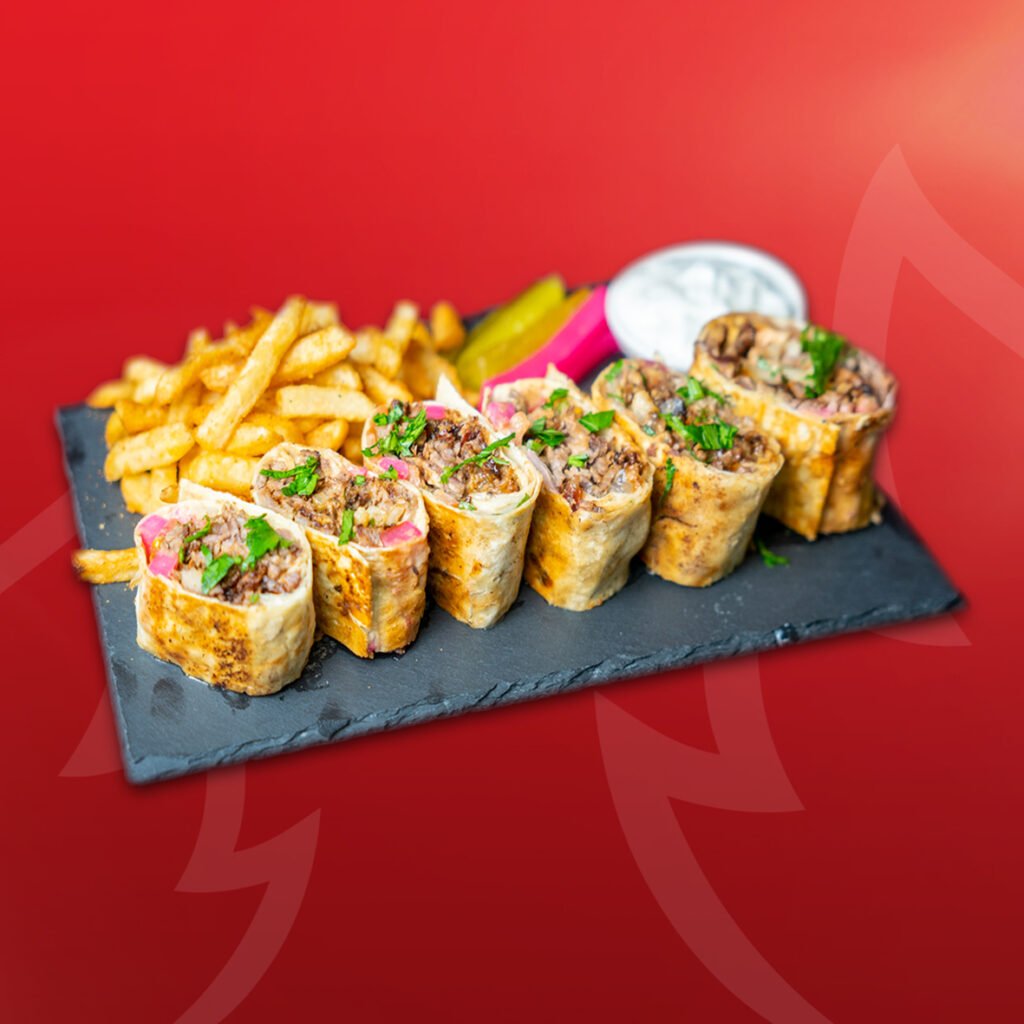 One Beef wrap cut into pieces with Fries, Pickles and Hummus on the side