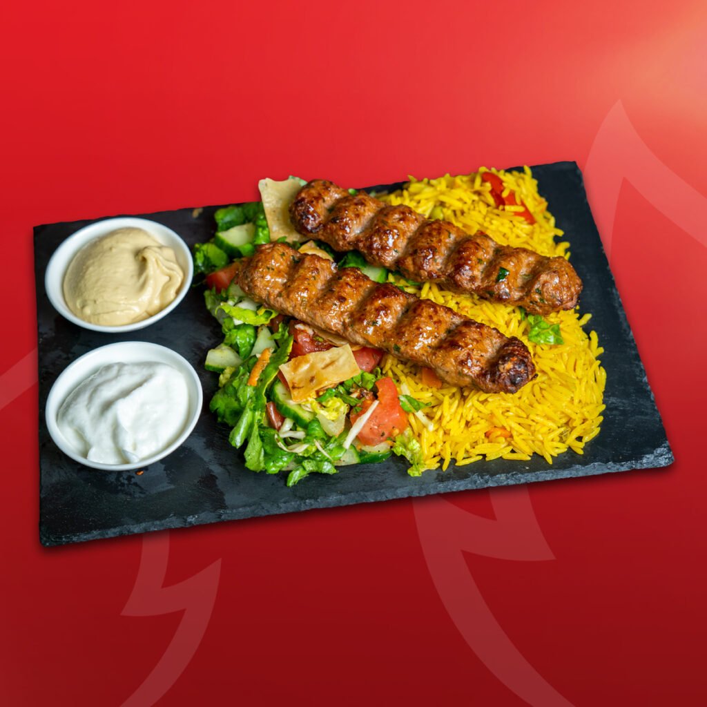 Two skewers of Kebab served with Rice or Fries, Salad, Garlic sauce, and Hummus