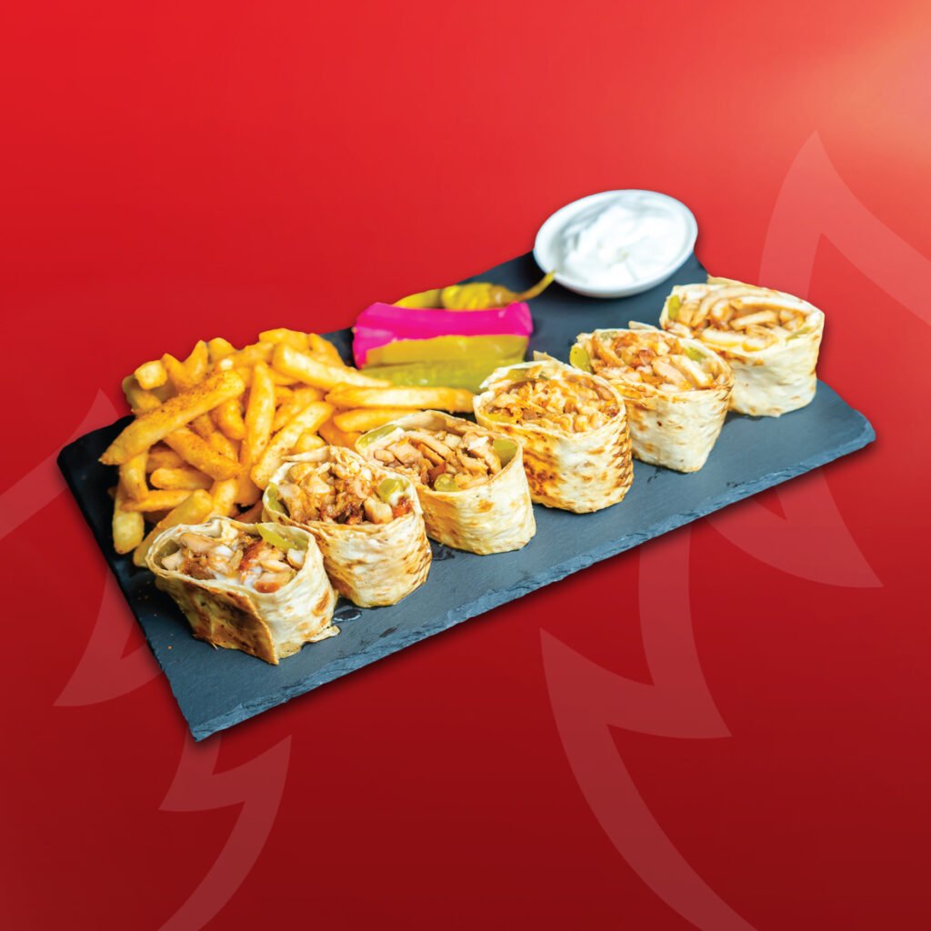 One Chicken wrap cut into pieces with Fries, Pickles and Garlic sauce on the side