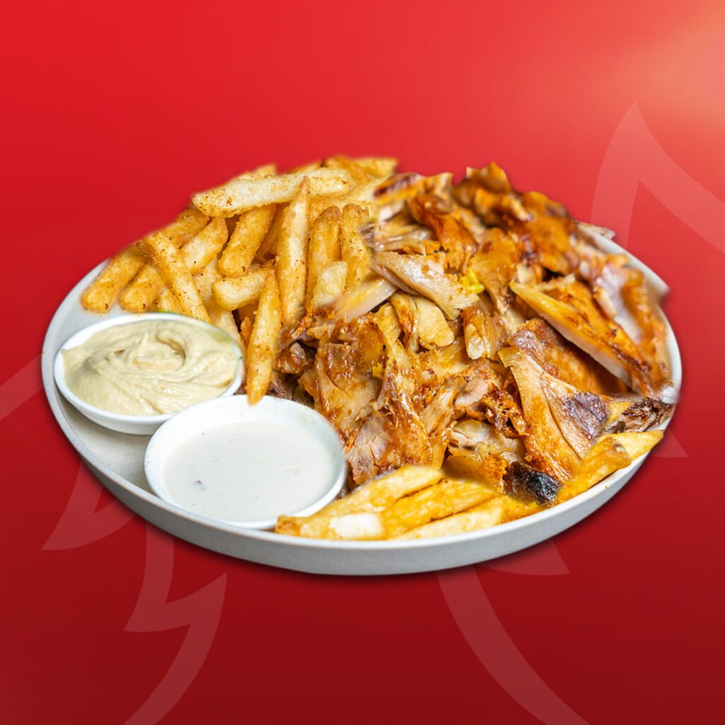 Chicken shawarma served with Rice or Fries, Salad, Garlic sauce, and Hummus