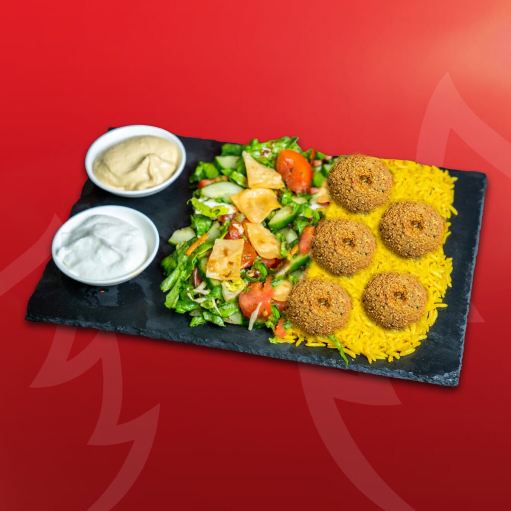 Falafel served with Rice or Fries, Salad, Garlic sauce, and Hummus