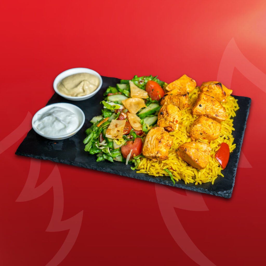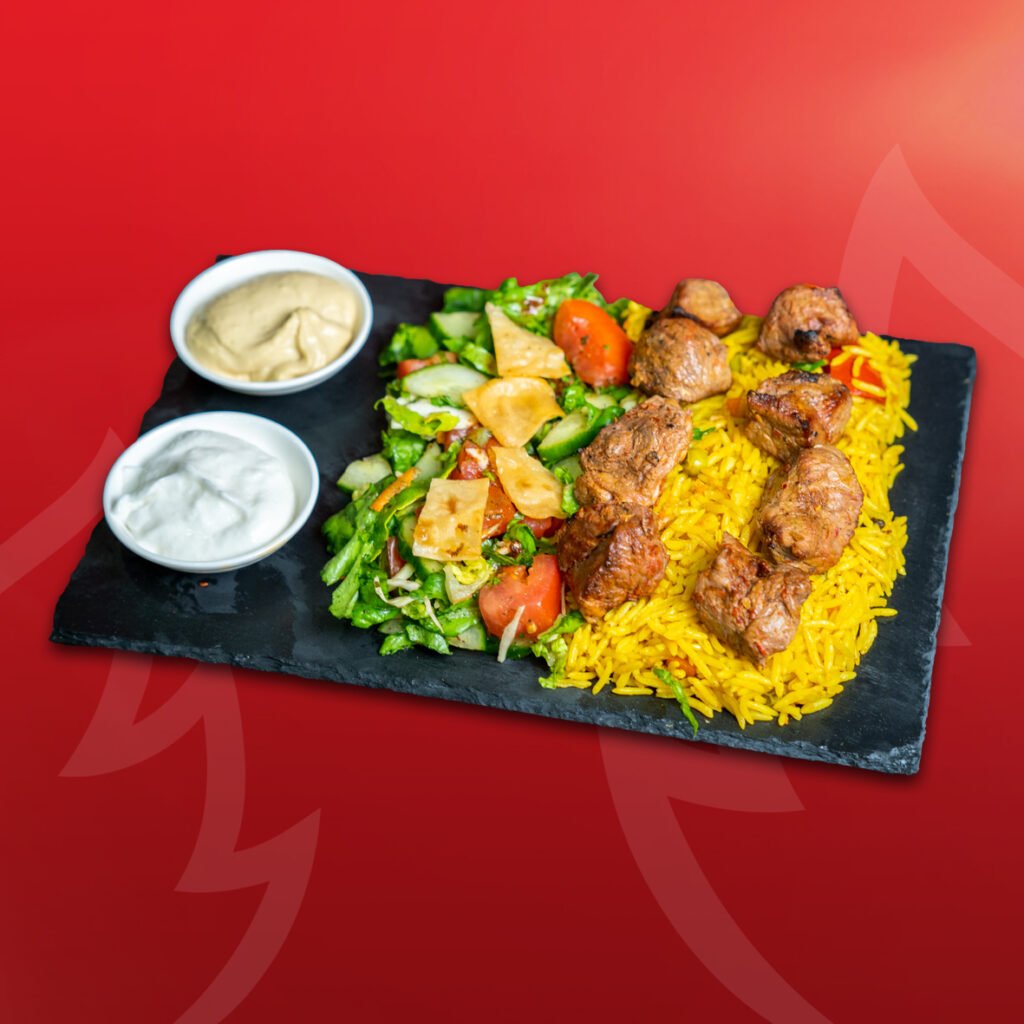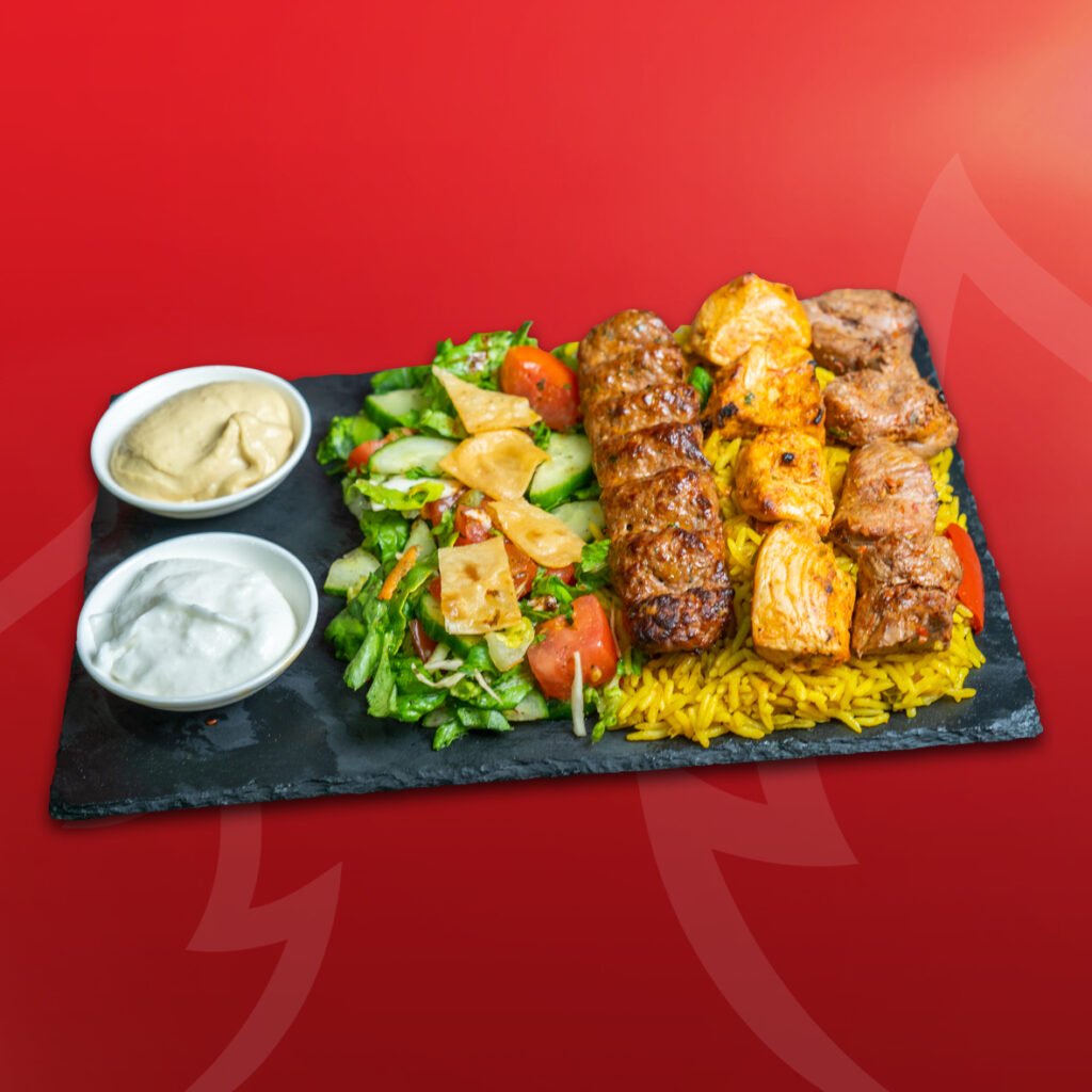 1 Kebab skewer, 1 Shish Taouk skewer, and 1 Lamb Souvlaki skewer served with Rice or Fries, Salad, Garlic sauce, and Hummus