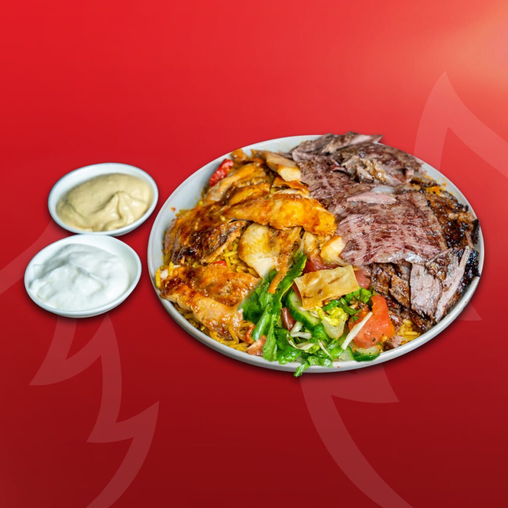 Beef and Chicken shawarma served with Rice or Fries, Salad, Garlic sauce, and Hummus