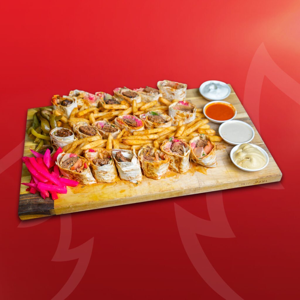 3 Wraps, cut into small pieces, served with Fries, Garlic sauce, Pickles, and Turnips