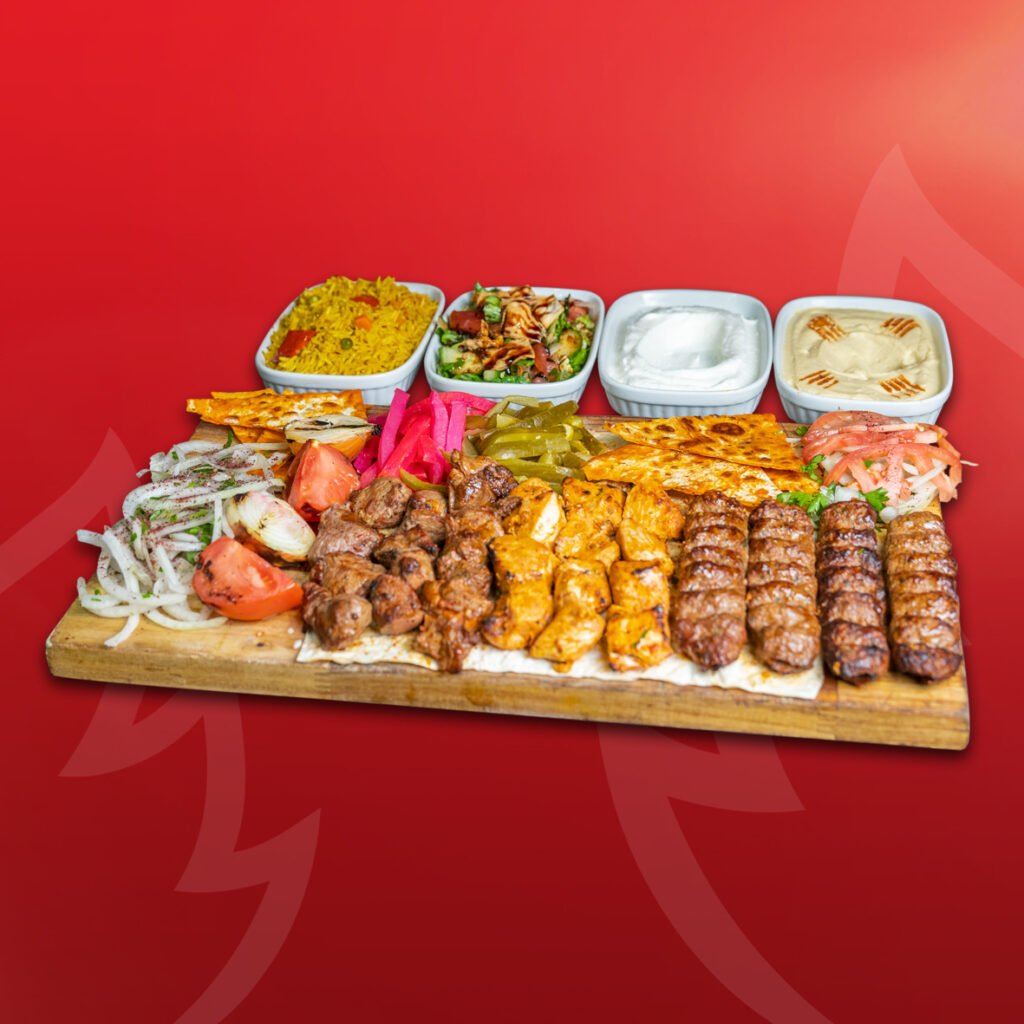 4 Kebab skewers, 3 Chicken Souvlaki skewers, and 3 Lamb Souvlaki skewers,served with your choice of Rice or Fries, Garlic sauce, Hummus, and Salad