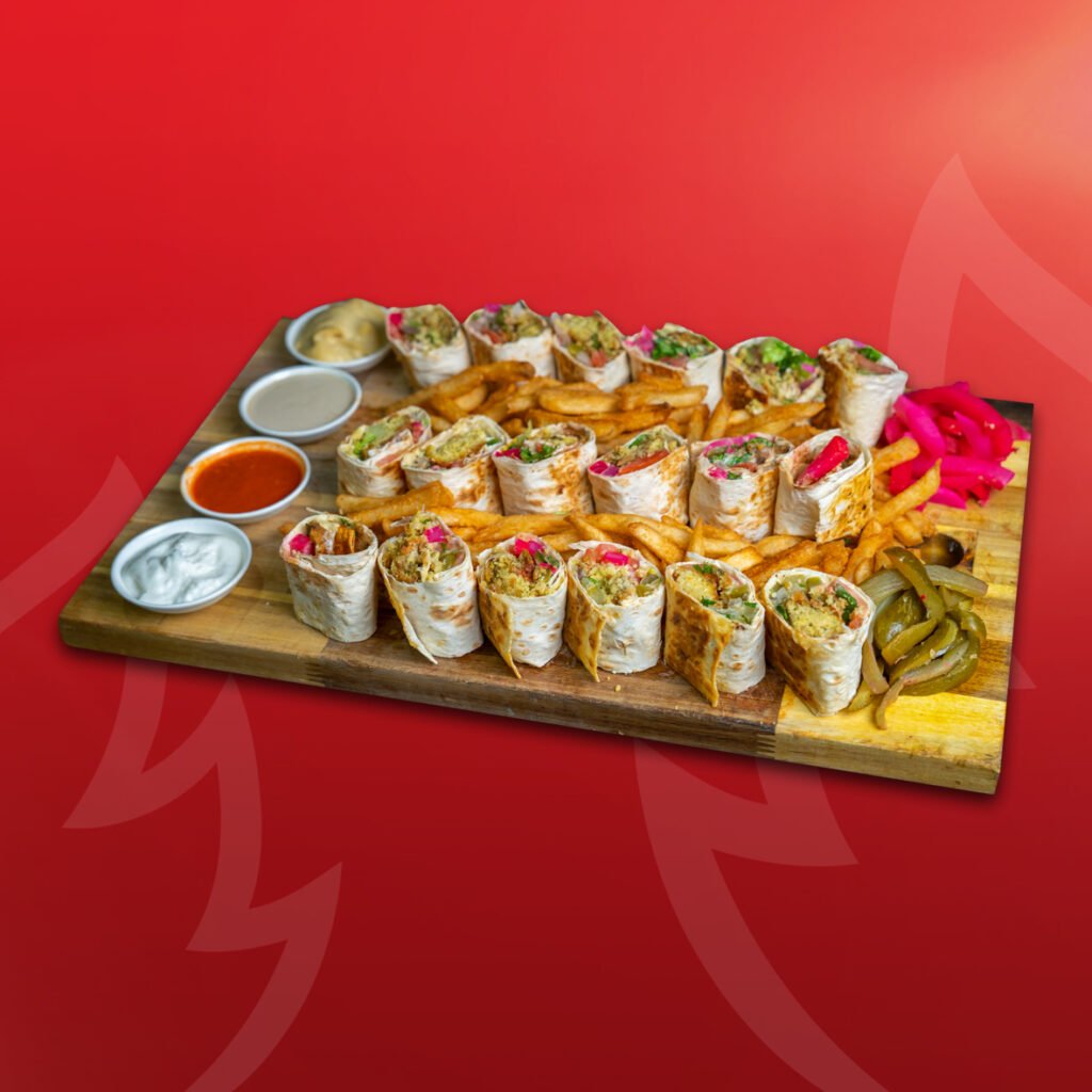 3 Wraps, cut into small pieces, served with Fries, Hummus, Pickles, and Turnips