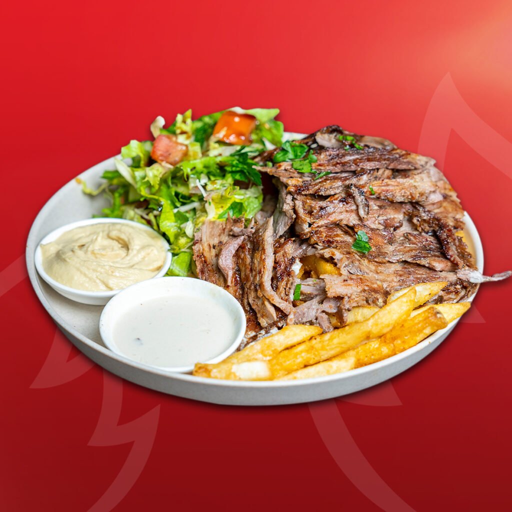 Beef shawarma served with Rice or Fries, Salad, Garlic sauce, and Hummus