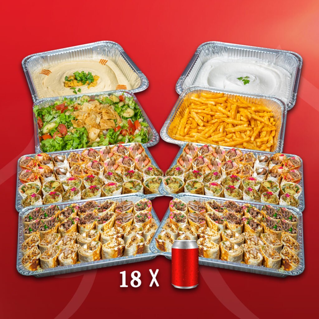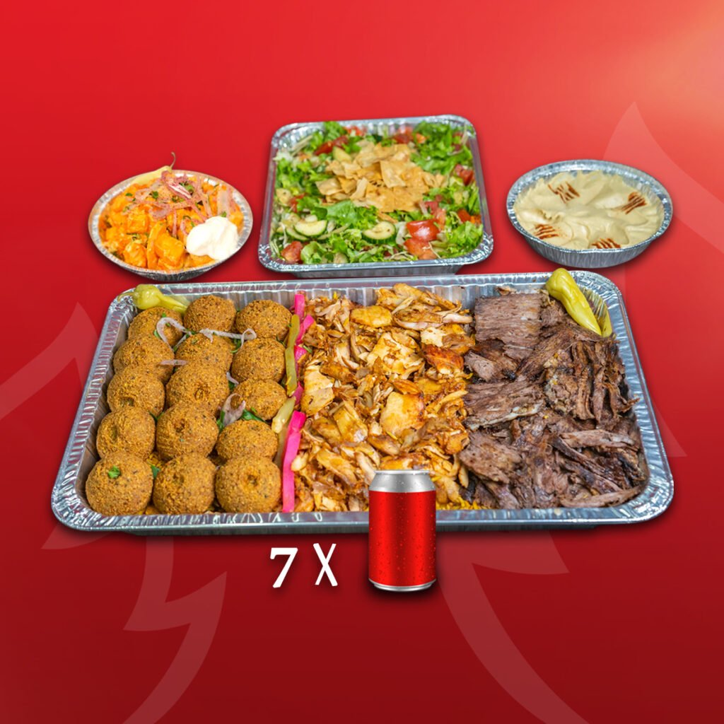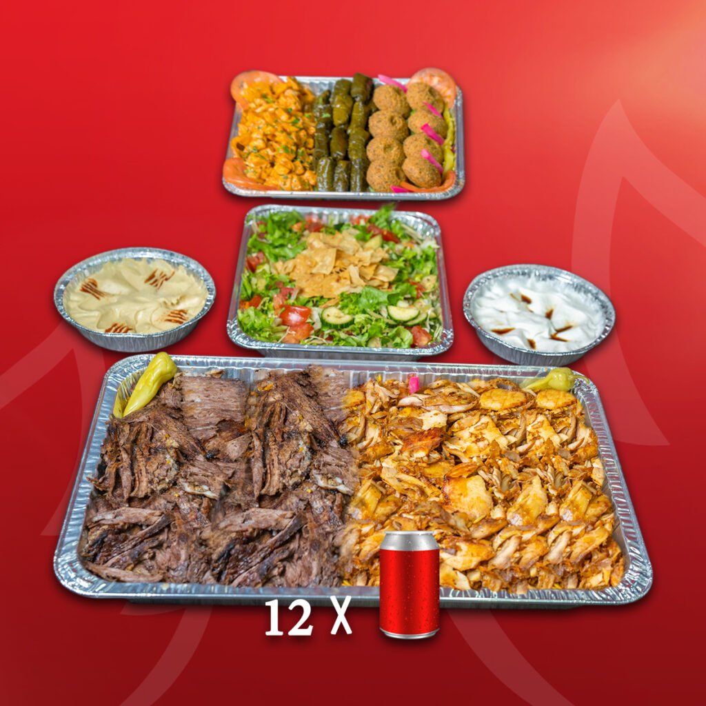 • 2 Large Mix Chicken & Beef Tray on Rice or Fries or Both.• 2 Large Mix Vegan Tray: (Falafel – Yalanji – Spicy Potatoes).• One Medium Fries.• One Medium Mix Salad Tray.• One Medium Mix Dip Tray.• One Medium Pickles.• Tahini Sauce.• 25 Mixed Pop cans.